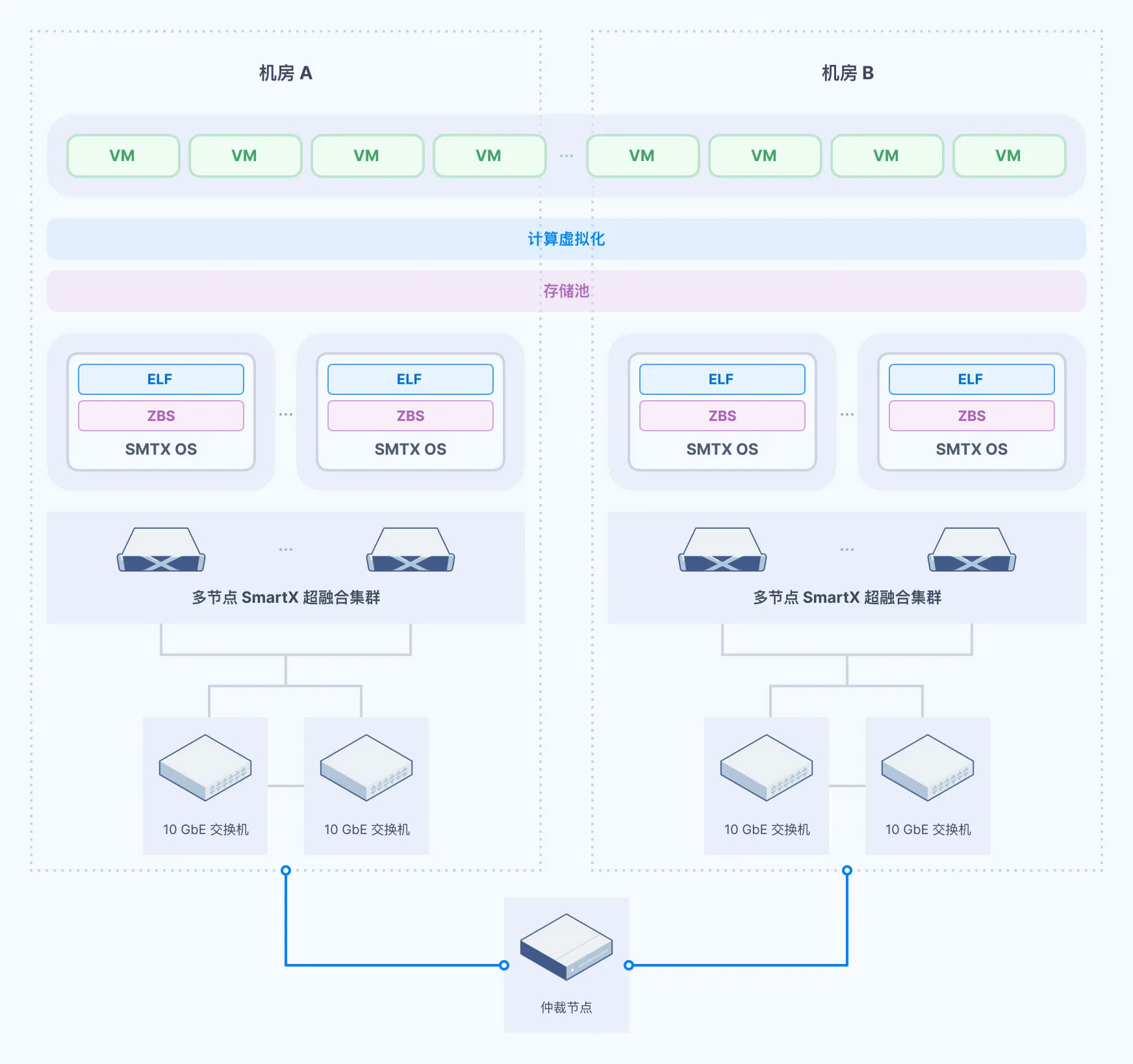 面對企業(yè)保持生產(chǎn)核心應用業(yè)務連續(xù)性的嚴苛需求,傳統(tǒng)三層式架構(gòu)的雙活方案不僅架構(gòu)復雜且成本高昂。SmartX 超融合支持跨數(shù)據(jù)中心的雙活集群架構(gòu),可實現(xiàn)數(shù)據(jù)的實時同步、應用服務在數(shù)據(jù)中心之間的容災切換。